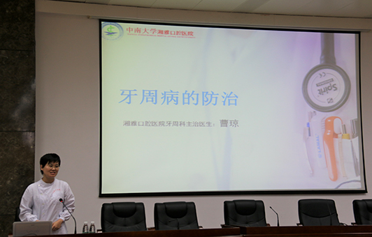 最后,湘雅口腔医院牙周科主治医生曹琼为大家进行口腔牙龈和牙周主题教育讲座。曹琼医生介绍了相关疾病的症状和病例,并普及了常见口腔疾病的预防策略和治疗措施。