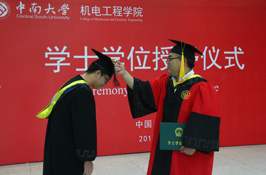 学位授予仪式在庄严的国歌中拉开帷幕,副院长张怀亮宣读授予学位学生名单。之后黄明辉院长为本届毕业生致辞,向各位毕业生表示祝贺并勉励同学们进一步努力,不忘责任,要永远保持一个赤诚之心。紧接着毕业生代表朱培章、秦涛发言,他们衷心感谢学院的精心栽培和各位老师的悉心指导,表示在今后的学习和工作中,会继续保持艰苦奋斗的精神。随后,邓华书记为校友联系人发放聘书。 在随后的学位授予仪式上,黄明辉教授、邓华教授、严宏志教授、刘德福教授、帅词俊教授、廖平教授、王艾伦教授、谭建平教授、夏建芳教授、蒋炳炎教授、贺继林教授、欧阳鸿武教授、朱文辉教授等为全体毕业生一一授予学位并合影,现场气氛喜庆而又热烈。 而钟掘院士也在紧张的会议之余,特意安排时间与学生合影留念。钟院士不仅参加了班级合影,还与学生一一拥抱,为学生送上毕业祝福,衷心祝愿各位毕业生前程似锦,一帆风顺。毕业生们现场激动不已,表示将会不负学院培养,争为祖国建设做出贡献。