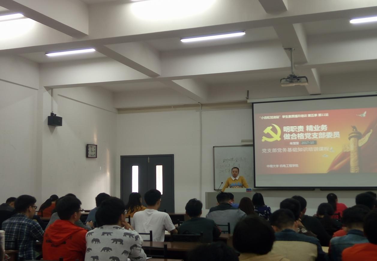 10月29日下午2点30分,学院分党校在C504教室举办学生党员骨干培训,分党校班导师肖楚楚以《明职责、精业务,做合格党支部委员》为主题,对全院党支部委员进行了详细的培训,学院党组织干事何建仁老师主持培训会,辅导员童俊杰、周芳、谭鑫、江俊鑫、吴凯等老师出席。