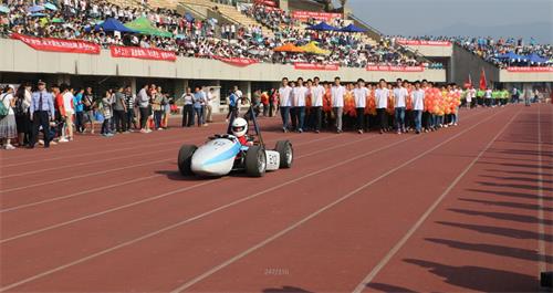 此次开幕式由高山书记主持,在运动员、裁判员有序入场后。各二级学院的方阵队伍随后入场,随着解说员缓缓叙述,各式各样的方阵有序出场,百花齐放,争奇斗妍。当机电院的方阵走过主席台时,瞬时引起一阵轰动,看台上的各位领导略有惊喜的注视着前方,场中的同学更是瞬间躁动起来,议论惊叹声不断,原来是惊现在机电院方阵队伍中的“方程式赛车”引起了大家的注意。