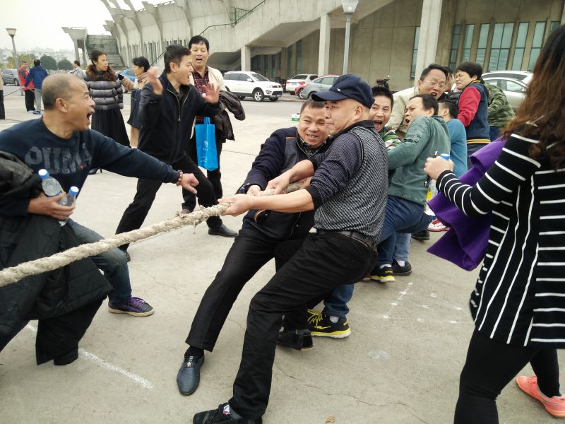 跳绳比赛讲究的是队员的默契和配合,8个队员站成一排齐跳,两端的人挥动长绳。比赛时,有些小组很快找对了方法,2分钟内跳了50个。而有些小组的队员男女老幼齐上阵,一直找不到跳动的节奏和步伐,总是有人绊到长绳,最后弃权跳了0个。最后的拔河比赛,赛制简单且参与度高,是增强小组凝聚力的很好的比赛,大家齐心协力,一鼓作气,使出浑身力气,最后由车辆组摘得大力王的称号。