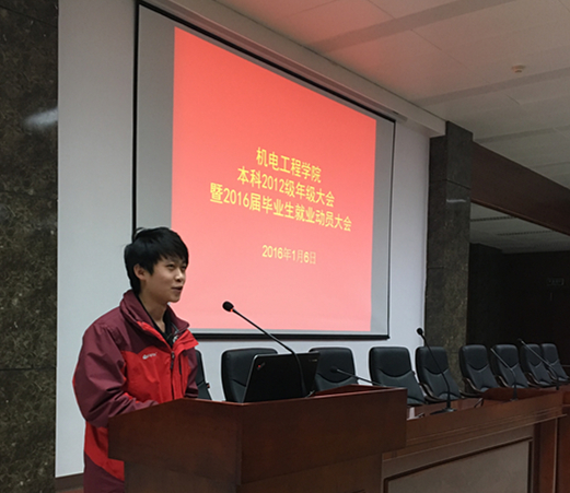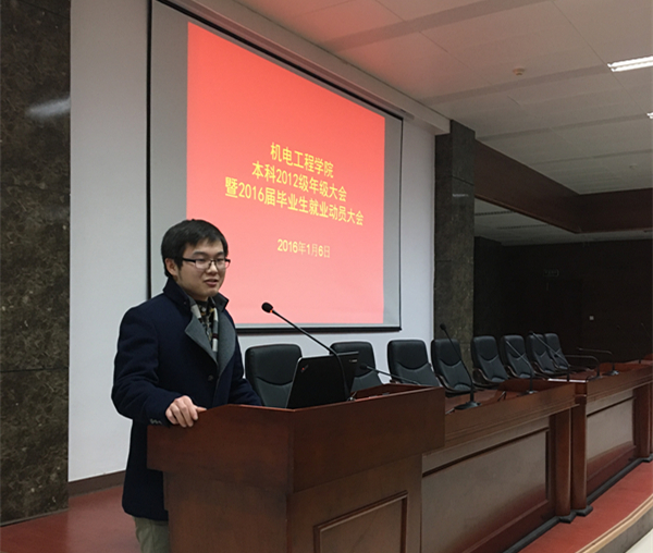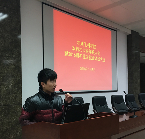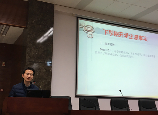 会议开始,辅导员童俊杰讲解了本学期放假及下学期开学的注意事项,嘱咐同学们要注意安全,按时保平安,按时到校,平平安安地过一个好年。童老师着重汇报了年级目前的就业情况,并讲解了求职就业的注意事项。最后,童老师预祝2012级的各位同学,寒假愉快,春节快乐;祝2016届的各位毕业生,顺利毕业,顺利就业,顺利创业,顺利求学。